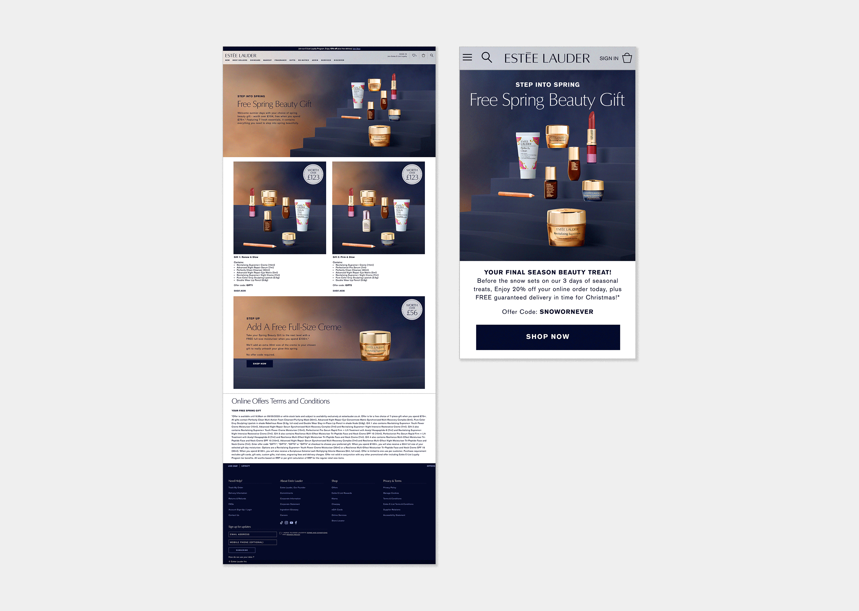 In my role at Estée Lauder Companies, I was responsible for designing key campaigns from inception for their monthly discount events and step up offers. These promotions are only available for a limited time and must be consistent with the other components that were live on the site during that period.